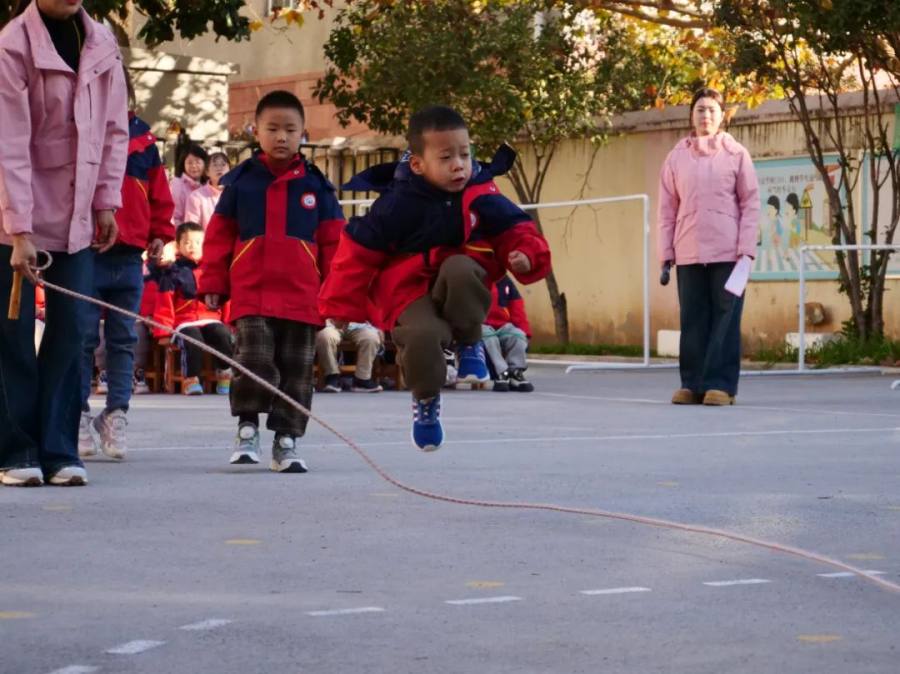 最后一个项目跳大绳,小朋友们一个紧跟着一个冲进大绳圈中,像轻盈的飞燕迅速在绳间飞跃,像快活的小鸟,欢快地从绳间跳过,又向灵活的小鹿,轻巧地从绳间越过。