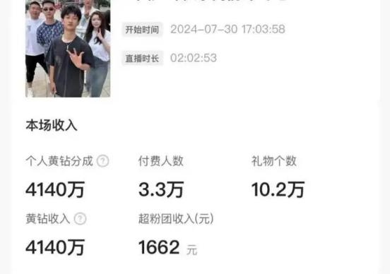 此外,据祁天道公开的直播收入截图显示,其在7月30日的单场直播收获3亿次点赞、10.2万件礼物,个人黄钻收入达到4140万,以此估算其单场直播礼物收入约为2万元。