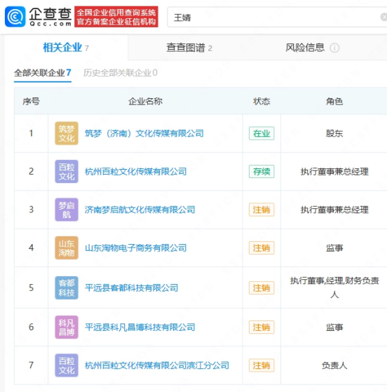 企查查APP显示,祁天道(真名孟凡斌)名下关联3家公司,仅筑梦(济南)文化传媒有限公司1家为存续状态,其妻子王婧名下7家公司中5家已注销。