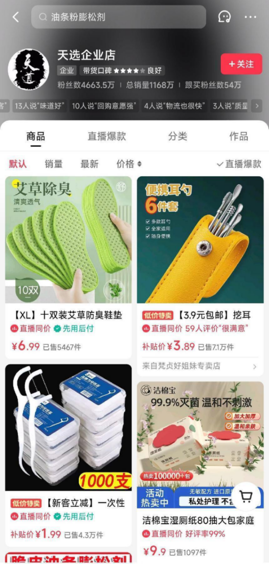 在快手平台,祁天道共有4660万粉丝,自称“快手第一户外主播”。其快手主页的“天选企业店”总销量达到1168万件,总销售额预计上亿。