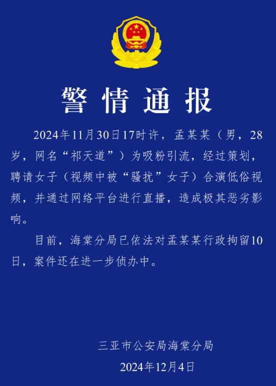 12月4日,三亚警方发布警情通报,2024年11月30日,孟某某(男,28岁,网名“祁天道”)为吸粉引流,经过策划,聘请女子(视频中被“骚扰”女子)合演低俗视频,并通过网络平台进行直播,造成极其恶劣影响。海棠分局已依法对孟某某行政拘留10日,案件还在进一步侦办中。