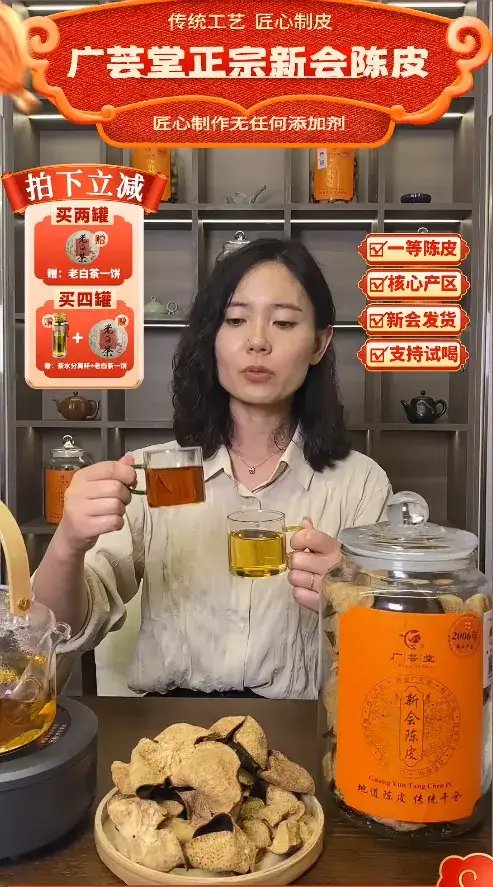 此外,滋补品类商家“广芸堂干仓陈皮”在直播过程中,主播会花费大量时间给用户科普怎样才能通过“一闻二看三喝”的方式鉴别买到的新会陈皮的真假好坏。主播在茶室直播时,也会亲自演示不同陈皮泡出的陈皮水区别,视觉呈现效果十分直观。