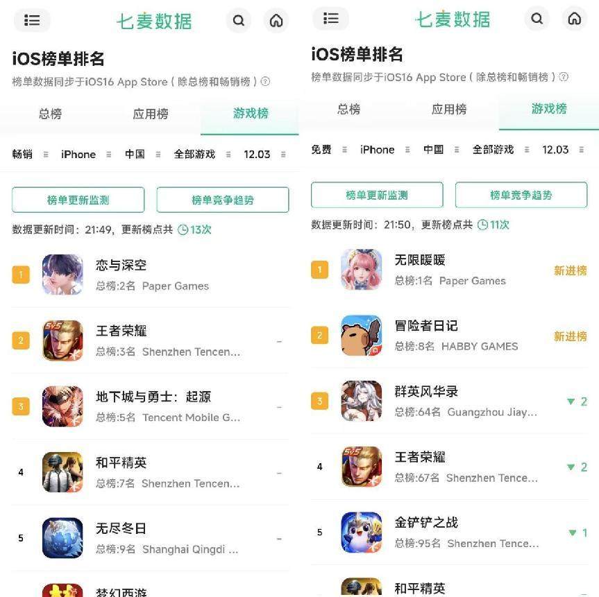 12月3日,《恋与深空》更新五星套装卡池“龙影陨落处”版本后,连续两天登顶iOS畅销榜,也是这个游戏近一个月以来第二次登顶iOS畅销榜。