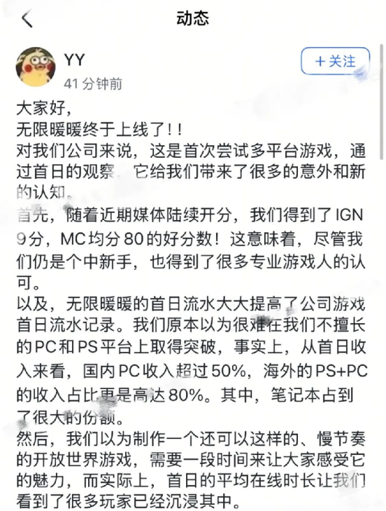 不过游戏上线第二天,叠纸CEO姚润昊发了一封内部信,提到《无限暖暖》的首日流水大大提高了公司游戏的首日流水纪录,其中国内PC收入超过50%,海外PS+PC的收入占比更是高达80%,游戏的首日平均在线时长也较为乐观。