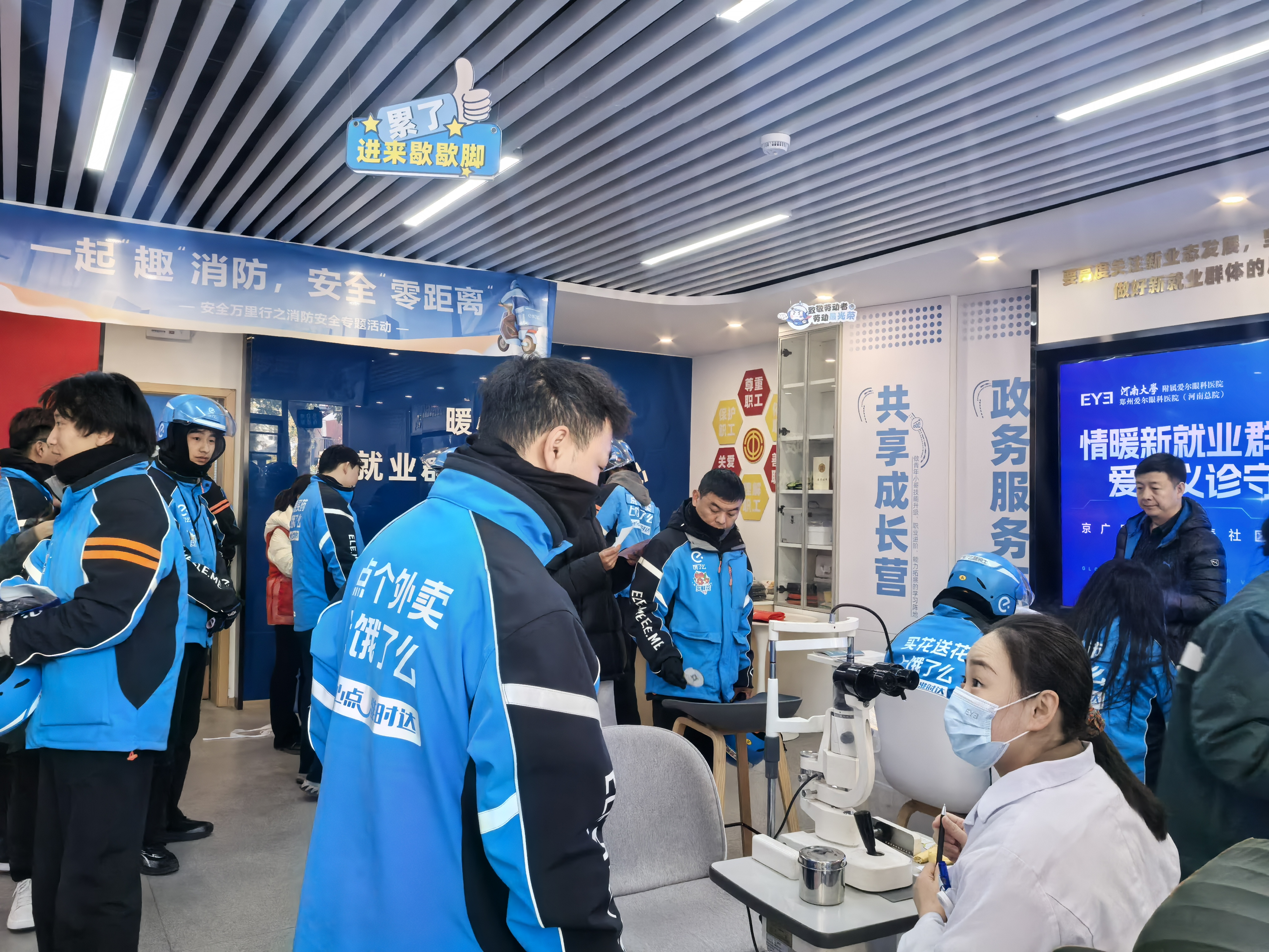 为进一步做好新就业群体的关爱工作,增强他们的归属感和幸福感,12月6日,二七区京广路街道冯春社区新时代文明实践站联合区委社会工作部和河南大学附属爱尔眼科医院,在辖区内为外卖员、快递员等新就业群体举办了“爱心义诊送健康”公益活动,为他们提供免费的眼健康检查服务。