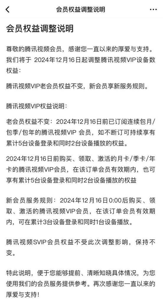 同时,老会员权益不变,2024年12月16日前已订阅连续包月/包季/包年的腾讯视频VIP会员,如不断订可持续享有累计5台设备登录和同时2台设备播放的权益。