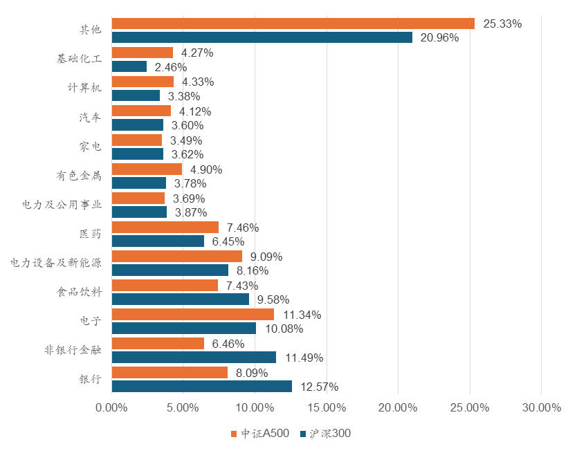 相比沪深300,中证A500采用全新视角筛选覆盖了更多新兴行业的龙头。从一级行业上来看,中证A500在电力设备及新能源、电子、医药、计算机等成长板块的权重更高。