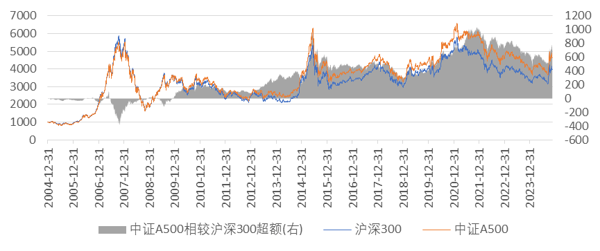 长期来看,中证A500相较沪深300也具有一定的超额,尤其是在股票市场牛市阶段,中证A500在更多细分行业上的均衡布局使得该指数呈现出更高的弹性。