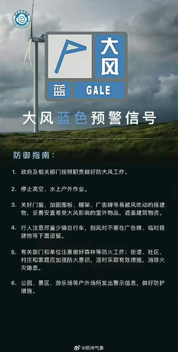 郑州市气象台发布大风蓝色预警信号,阵风7级左右