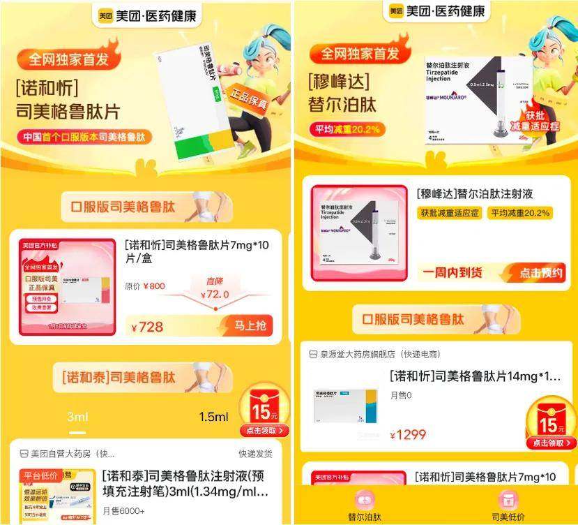 近年来,两大药企可谓动作频频:11月9日,诺和盈(减重版司美格鲁肽)在美团买药等平台开启首发预约与到店门诊服务。12月9日,诺和忻(口服版司美格鲁肽)与穆峰达(减肥版替尔泊肽)同日首发预约通道,其中口服司美格鲁肽可直接下单,替尔泊肽可预约到店服务。