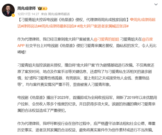 当晚,代理律师周兆成发表声明,指出《他是谁》未获刁爱青家属同意,便以“南大碎尸案”为背景改编,不仅详细还原了案件细节,还捏造了与刁爱青个人生活相关的情节,如性格孤僻、恋爱关系等,与事实不符,损害了刁爱青及其家属的名誉和隐私权。