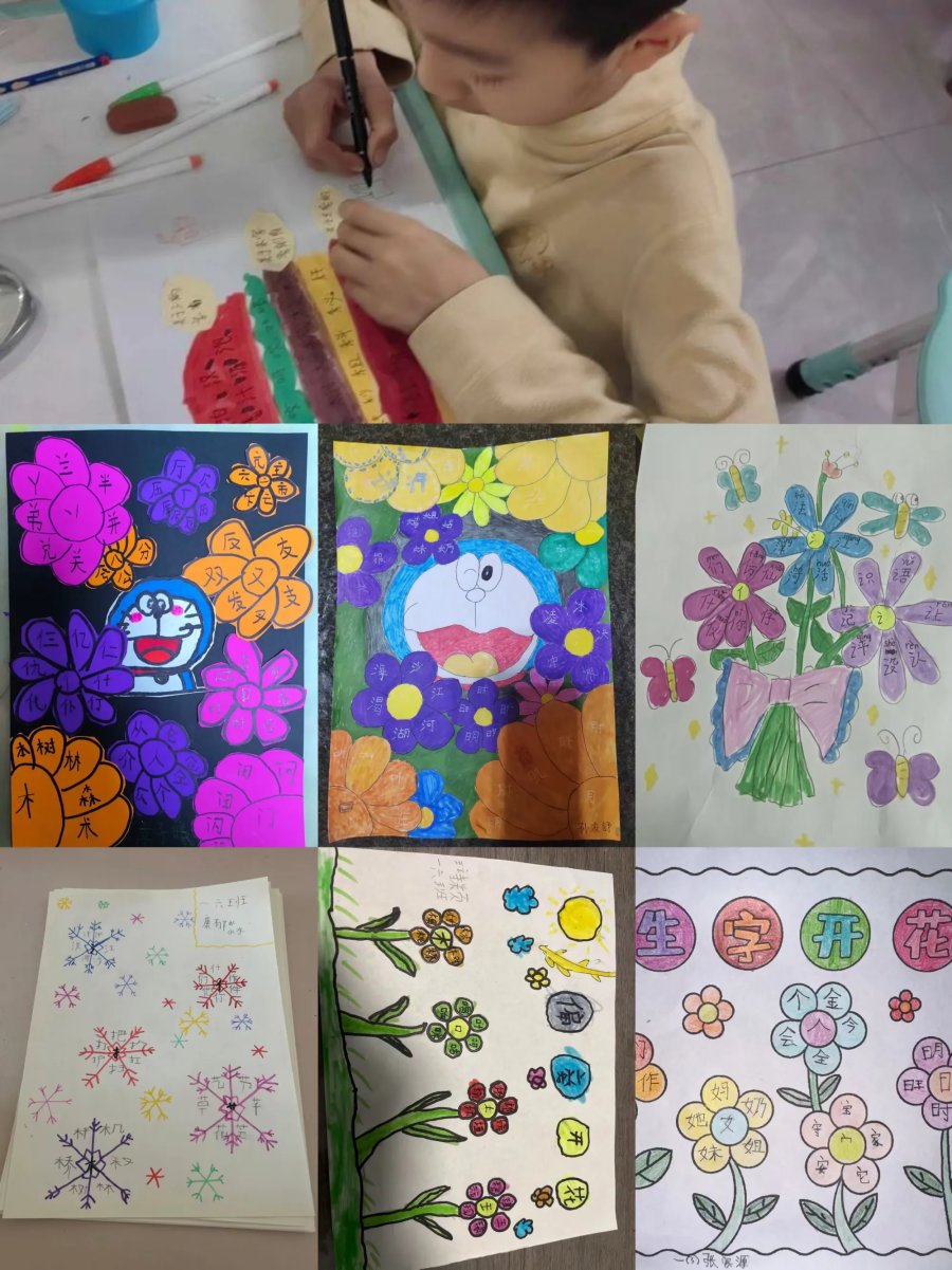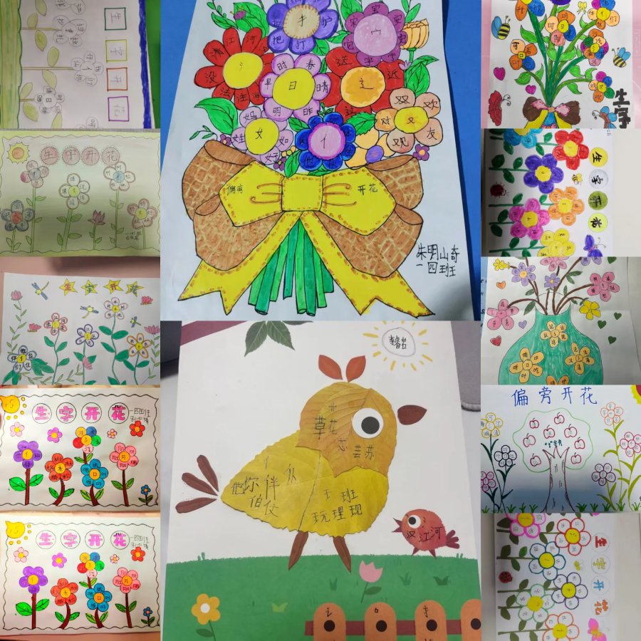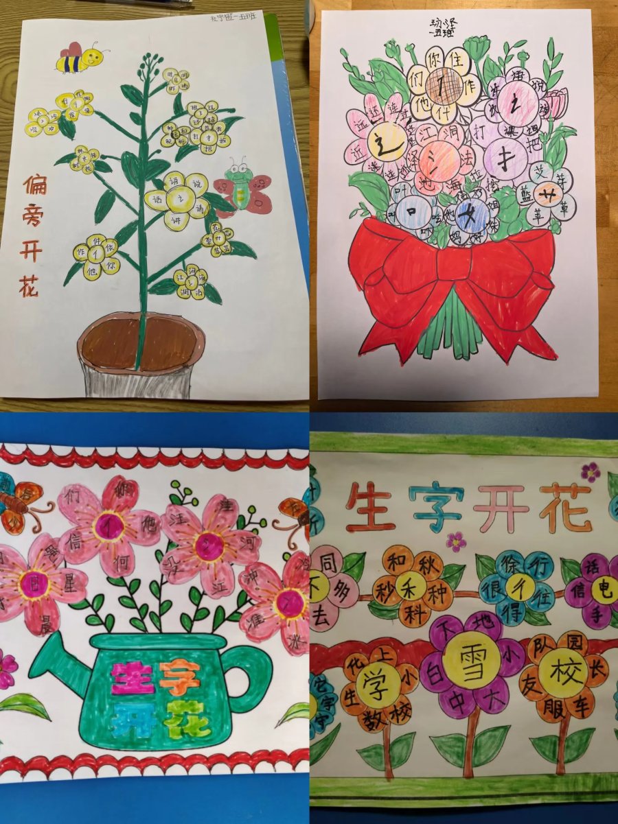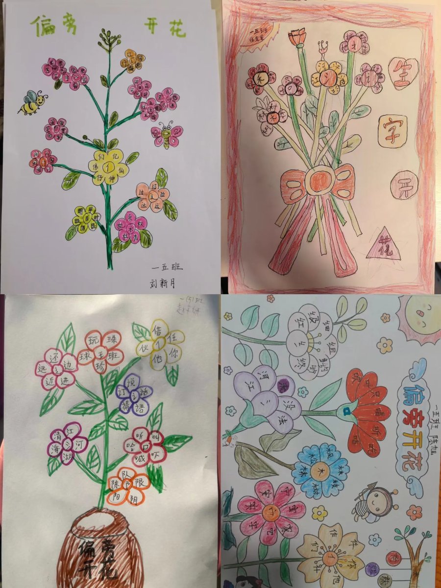为激发孩子们的识字兴趣,提高识字的效率,巩固偏旁识字的方法,助力孩子们养成,主动识字的习惯,这一周我们设计"偏旁开花"实践作业。偏旁作花蕊,积累的生字作花瓣,用自己喜欢的方式动手写一写、涂一涂,绘出一朵朵一束束美丽的生字花。偏旁相同的汉字在同学们的画笔下找到了自己的好朋友。