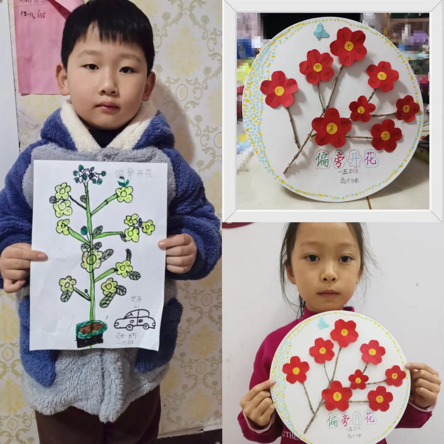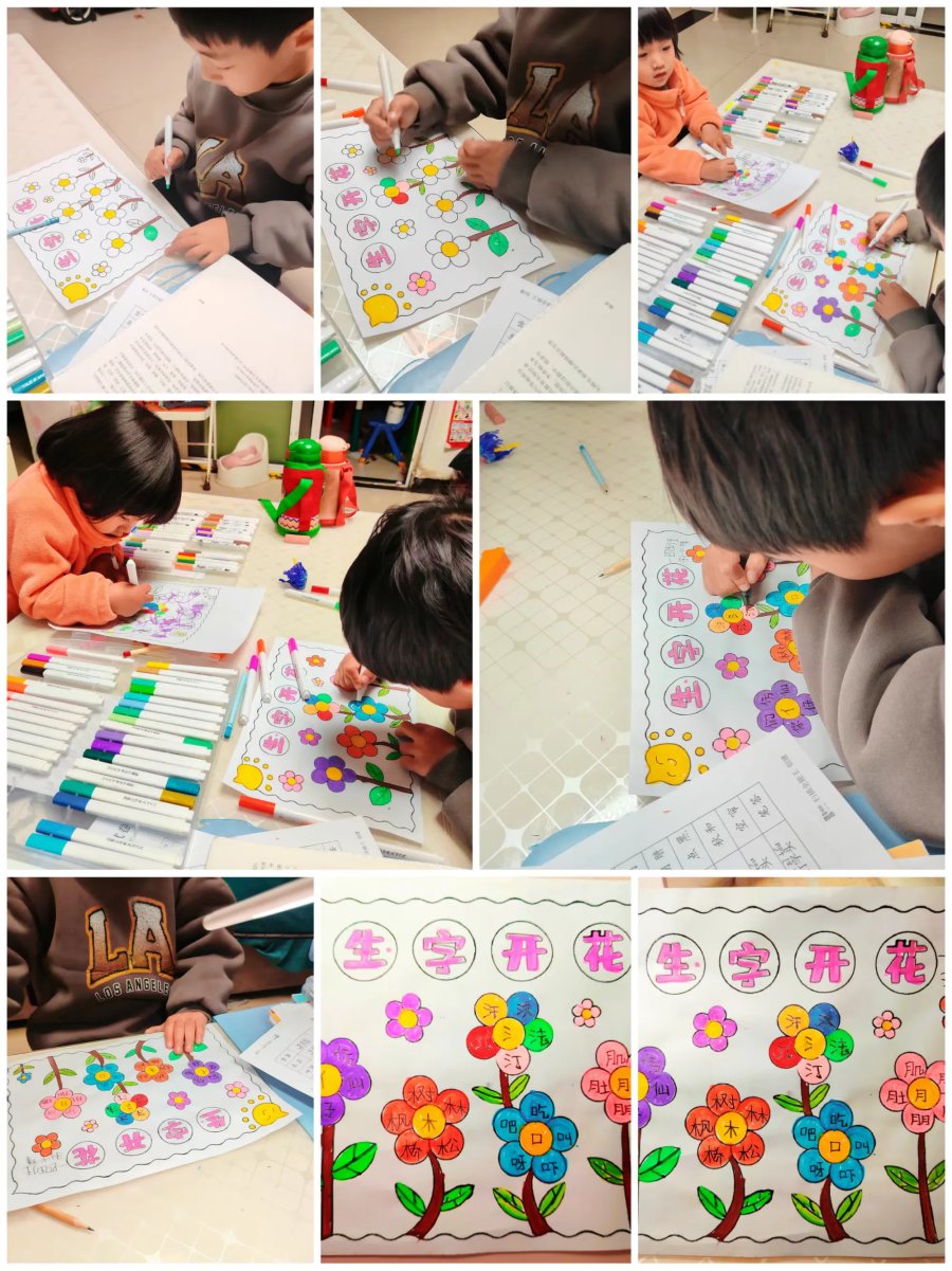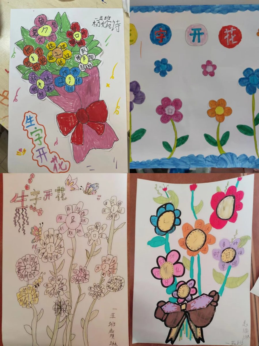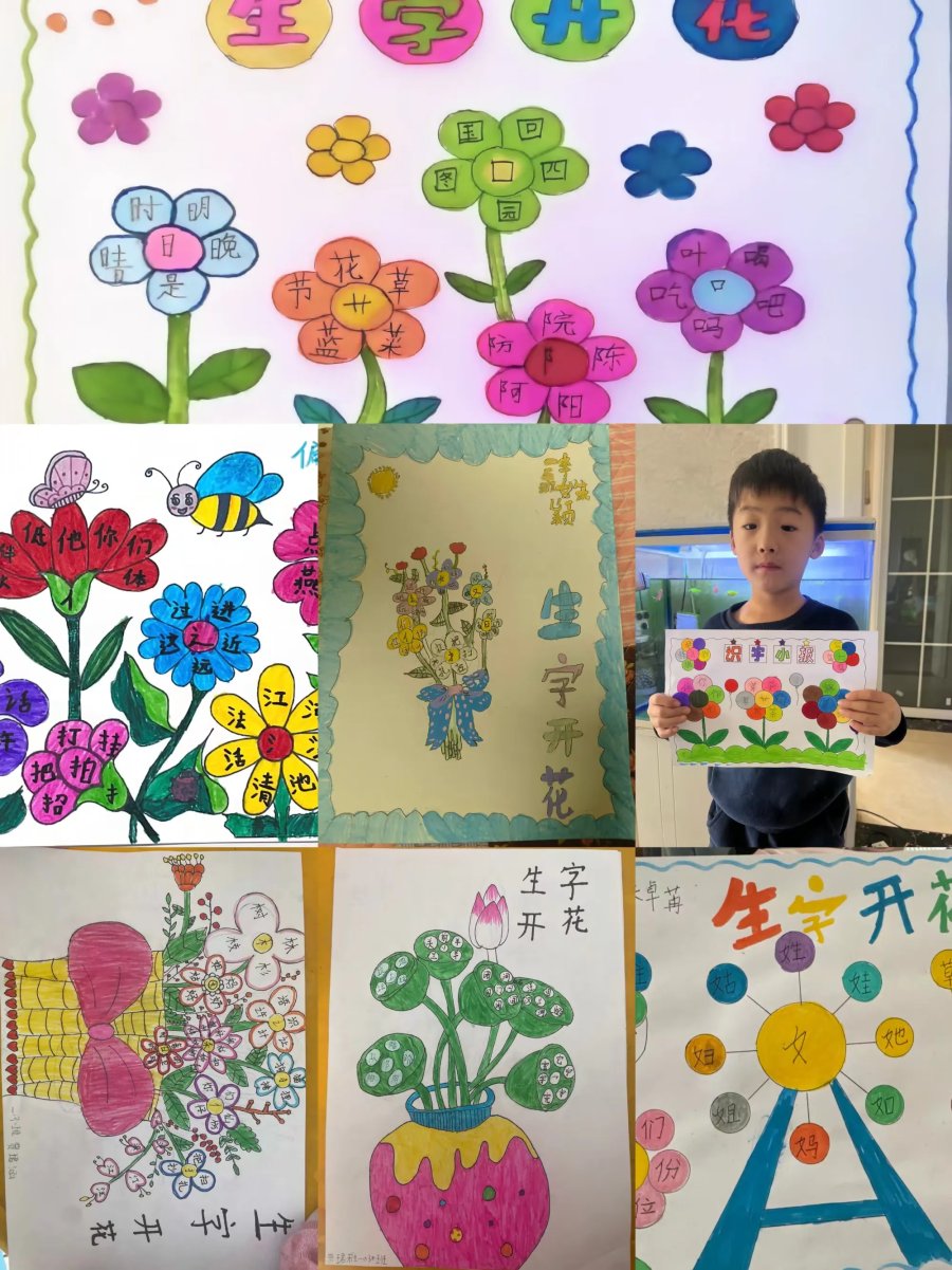 为激发孩子们的识字兴趣,提高识字的效率,巩固偏旁识字的方法,助力孩子们养成,主动识字的习惯,这一周我们设计"偏旁开花"实践作业。偏旁作花蕊,积累的生字作花瓣,用自己喜欢的方式动手写一写、涂一涂,绘出一朵朵一束束美丽的生字花。偏旁相同的汉字在同学们的画笔下找到了自己的好朋友。