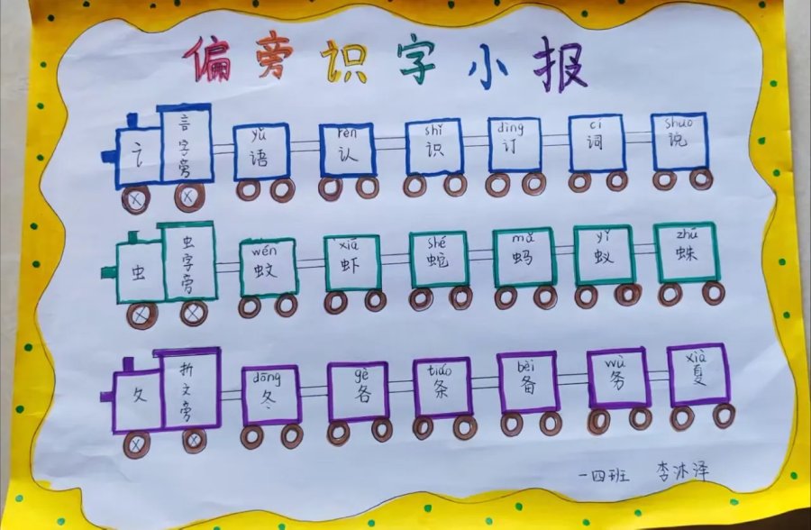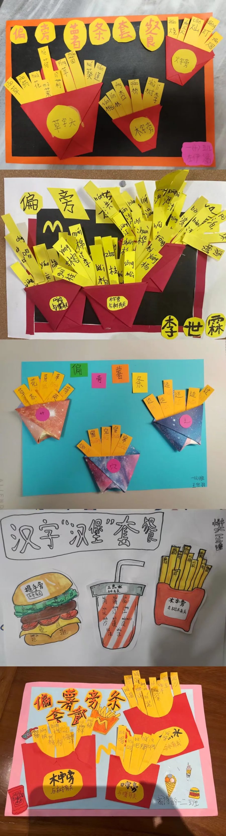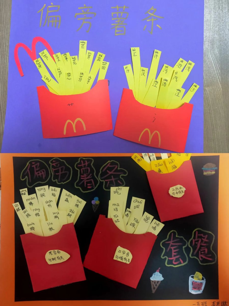 瞧!生字词和图画的完美碰撞,让识字变得不再枯燥无味。孩子们借用自己手中的画笔,将一个个具有独特魅力的汉字与多彩的图画联系起来,制作出了一份份精美的“偏旁开花”作品。还有的孩子创意无限,制作了“偏旁薯条套餐”,快来一年级的“偏旁花园”、“偏旁美食店”游赏吧!