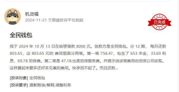 在黑猫投诉平台上,有投诉者称,通过哈啰借款8000元,放款方是全民钱包(实际应为哈啰导流至全民钱包,全民钱包再对接资方),分12期,每月还款803.65元。803.65元包括两笔,一笔为756.47元,包含本金653元、利息33.69元,担保费69.78元。另一笔为47.18元,为担保服务费。两笔担保费合计116.96元,是利息的3.47倍。