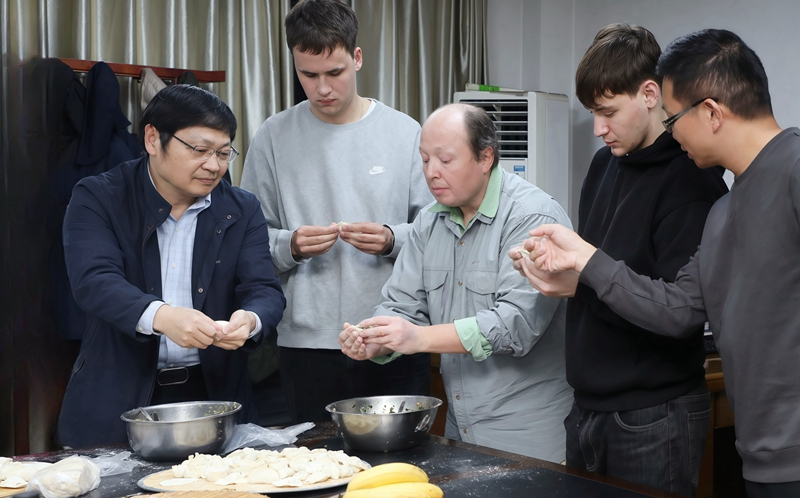 活动开始,李学志介绍了“冬至”节气的由来、含义及相关传统节事活动,并鼓励外籍师生要做有温度、有情怀的中华文化传播者。活动现场,李学志手把手指导外籍师生包饺子,与大家一起团馅儿、和面、擀皮。大家分工合作各显其能,忙得不亦乐乎,现场其乐融融。外籍师生对学校举办这次活动以及对他们给予的关心和温暖表达了感谢之情,纷纷表示非常喜欢中国的传统文化与节日,能够时刻感受到学校给予的浓浓爱意与温暖。