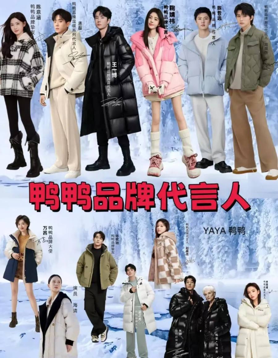 例如羽绒服赛道的鸭鸭,作为有底蕴且翻红成功的品牌,才有可能构建明星代言矩阵,并持续与王一博这样的顶流合作。