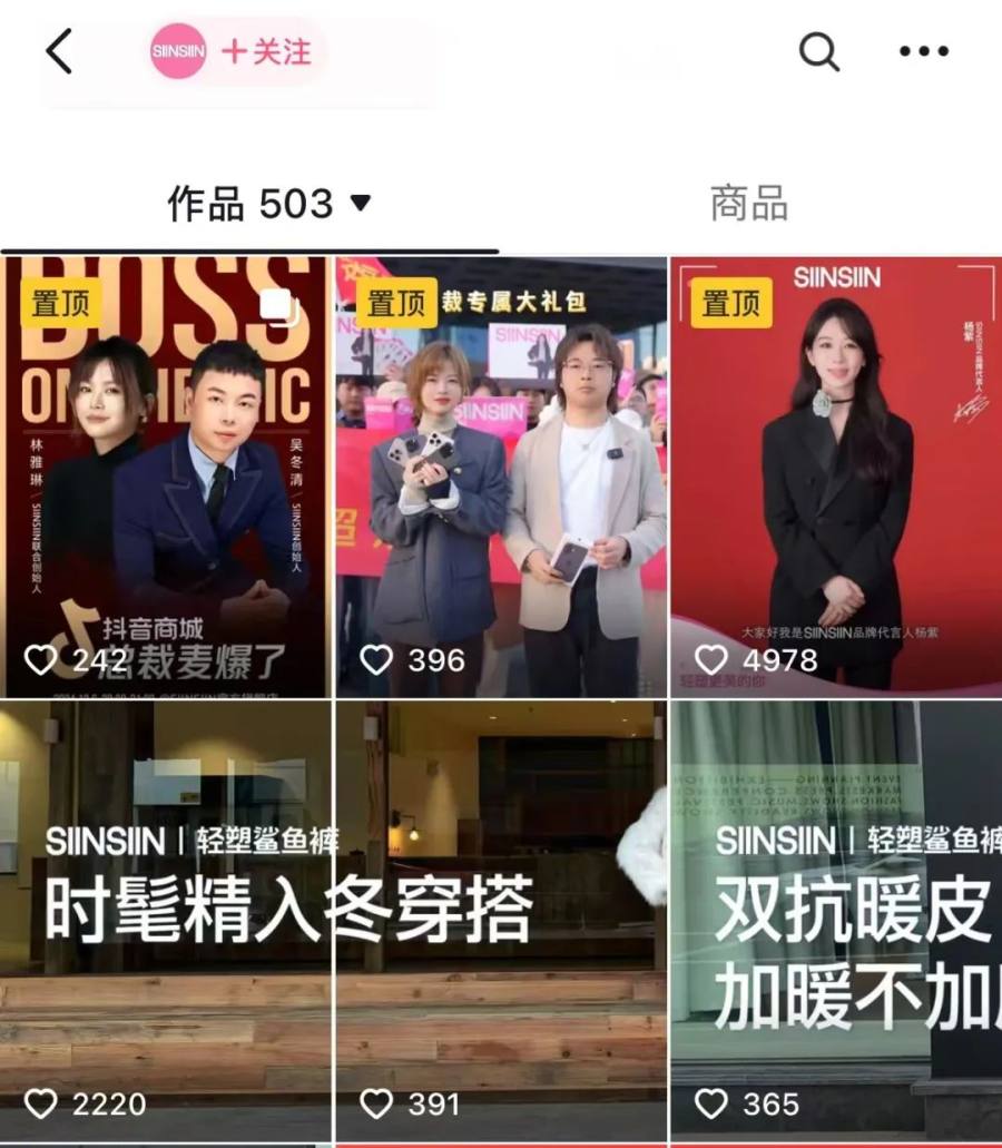 近一步观察,SIINSIIN品牌抖音账号除了穿搭内容,直播预告、促销广告也占很大比重。据了解,大品牌不仅在抖音带货,还把抖音当营销平台,只要广告费不超过总销售额(GMV)的45%,就会尽量放大投放量。