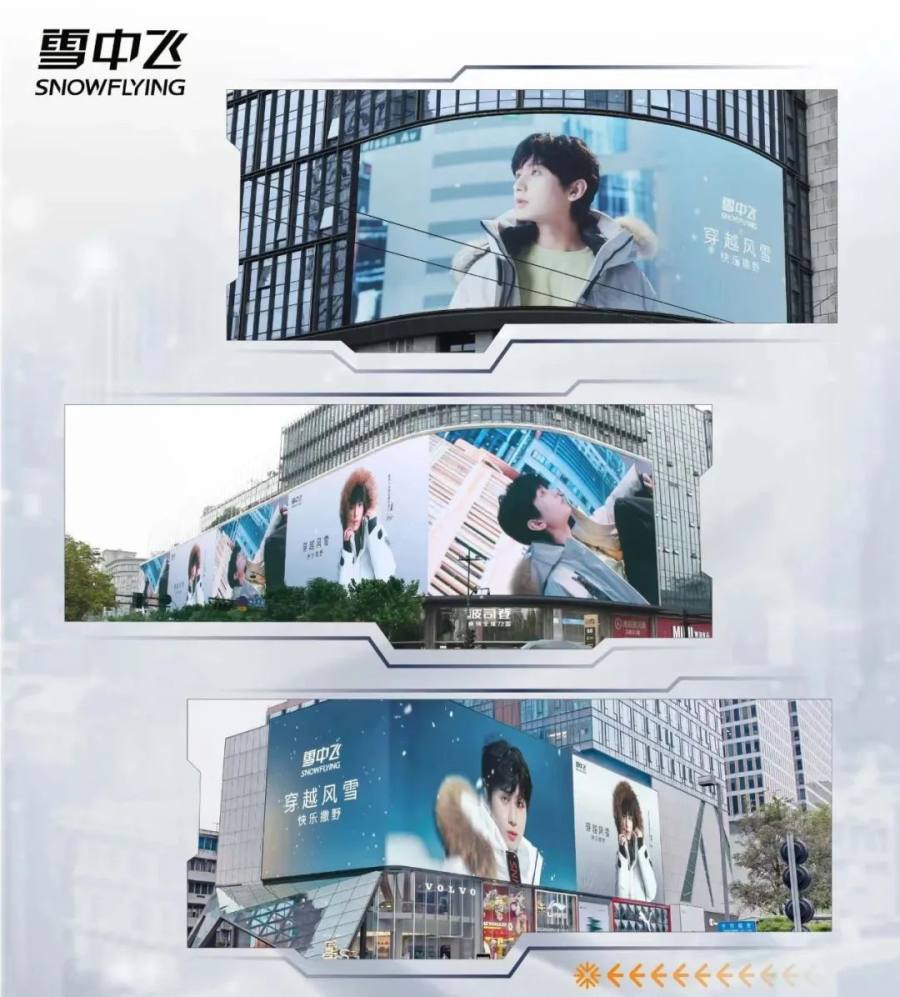 可全域营销意味着高投入,以雪中飞选择成毅作为代言人为例,品牌配合了大量推广资源。线上,通过微博、抖音、淘宝、小红书等各大APP开屏广告,线下,通过户外广告、电梯广告和线下应援大屏在北京、上海、杭州、成都、郑州、天津、石家庄、西安等全国地标上线。