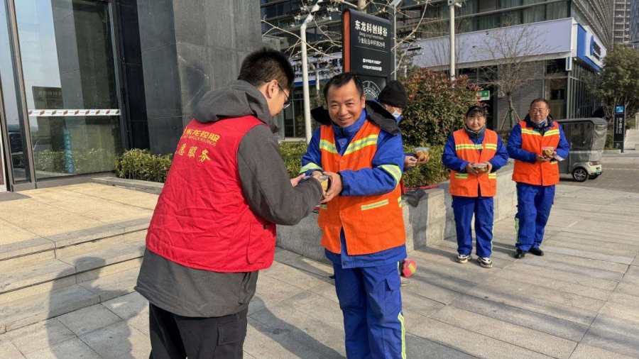 12月20日,河南东龙控股集团有限公司工会组织职工包饺子、一起过冬至,公司职工志愿者还为龙湖金融岛周边一线环卫工人送去了热气腾腾的暖心饺子。