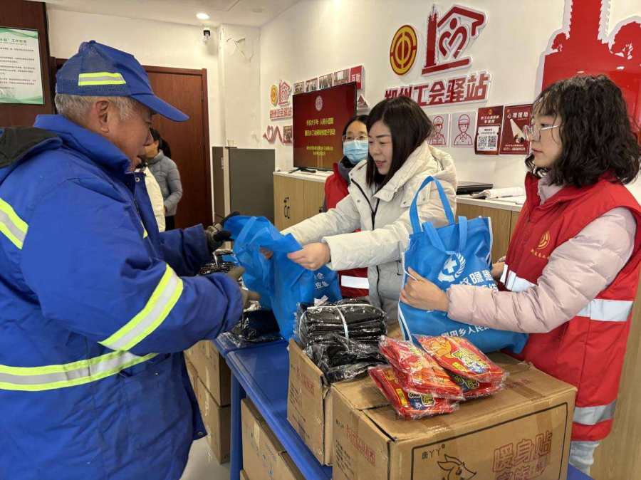 12月19日,圃田乡工会联合会在党群服务中心工会驿站为辖区户外劳动者和新就业形态劳动者发放包含手套、围巾、暖宝宝的工会暖心包。
