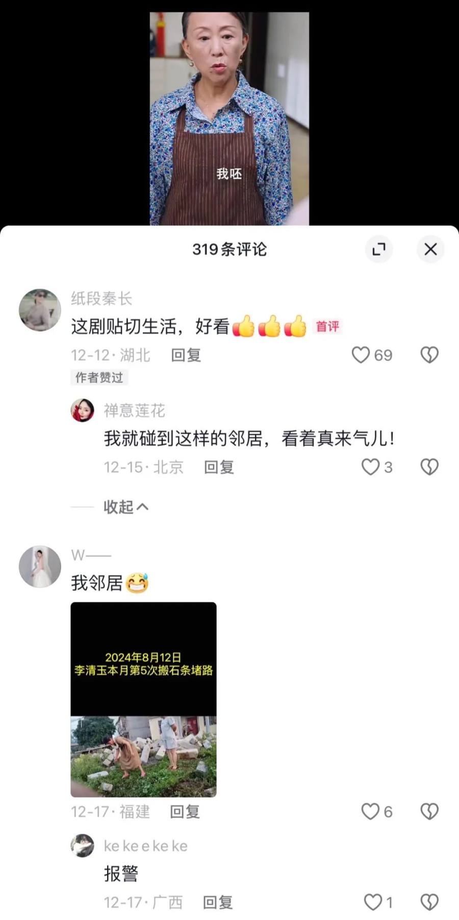 整部剧抓住了“邻里关系”的真正“爽点”,即讲道理讲不通的时候,武力成为更有效的解决方式。评论区纷纷借着剧情吐槽自己没素质的邻居,与女主共情,通过女主的暴力复仇,纾解对没素质“恶邻”的怨气。