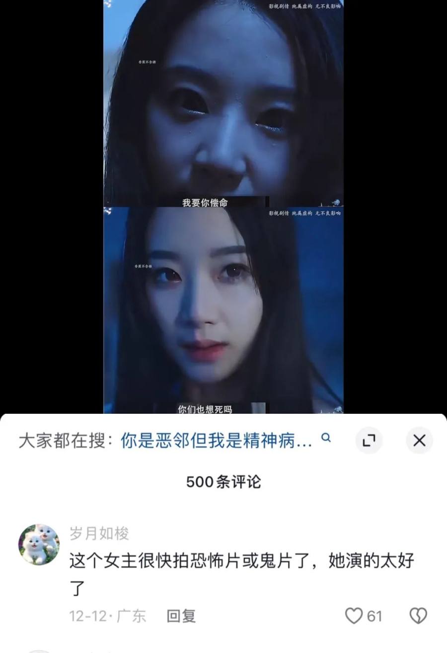 女主在“正常”与“病发”状态之间来回切换,前期女主将短暂的失控感,与失控后被“抚慰犬”拉回理智的隐忍表现得很生动。后期“复仇”剧情中,女主“疯批”感回归,表演更有张力,配合镜头与bgm,评论区纷纷表示有被吓到。