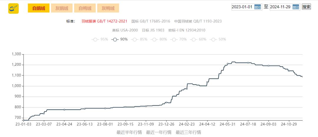 据羽绒金网数据显示,截至2024年,90%白鹅绒的价格已涨至每公斤1100元,较去年同期的900多元增长约20%,白鸭绒的涨幅则更为明显,从每公斤300多元涨到500多元。