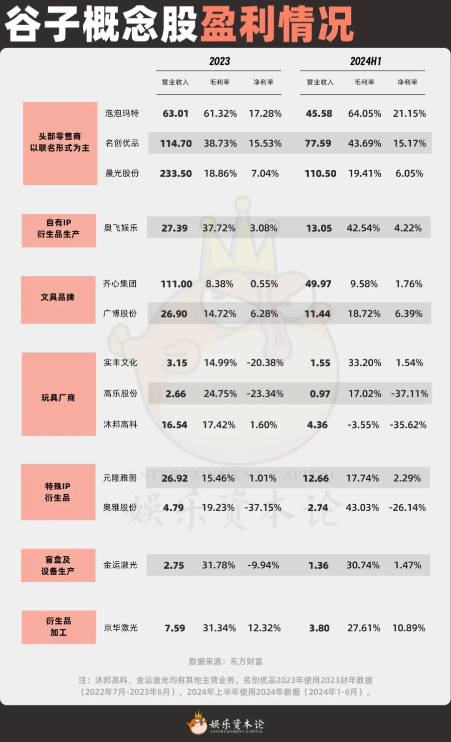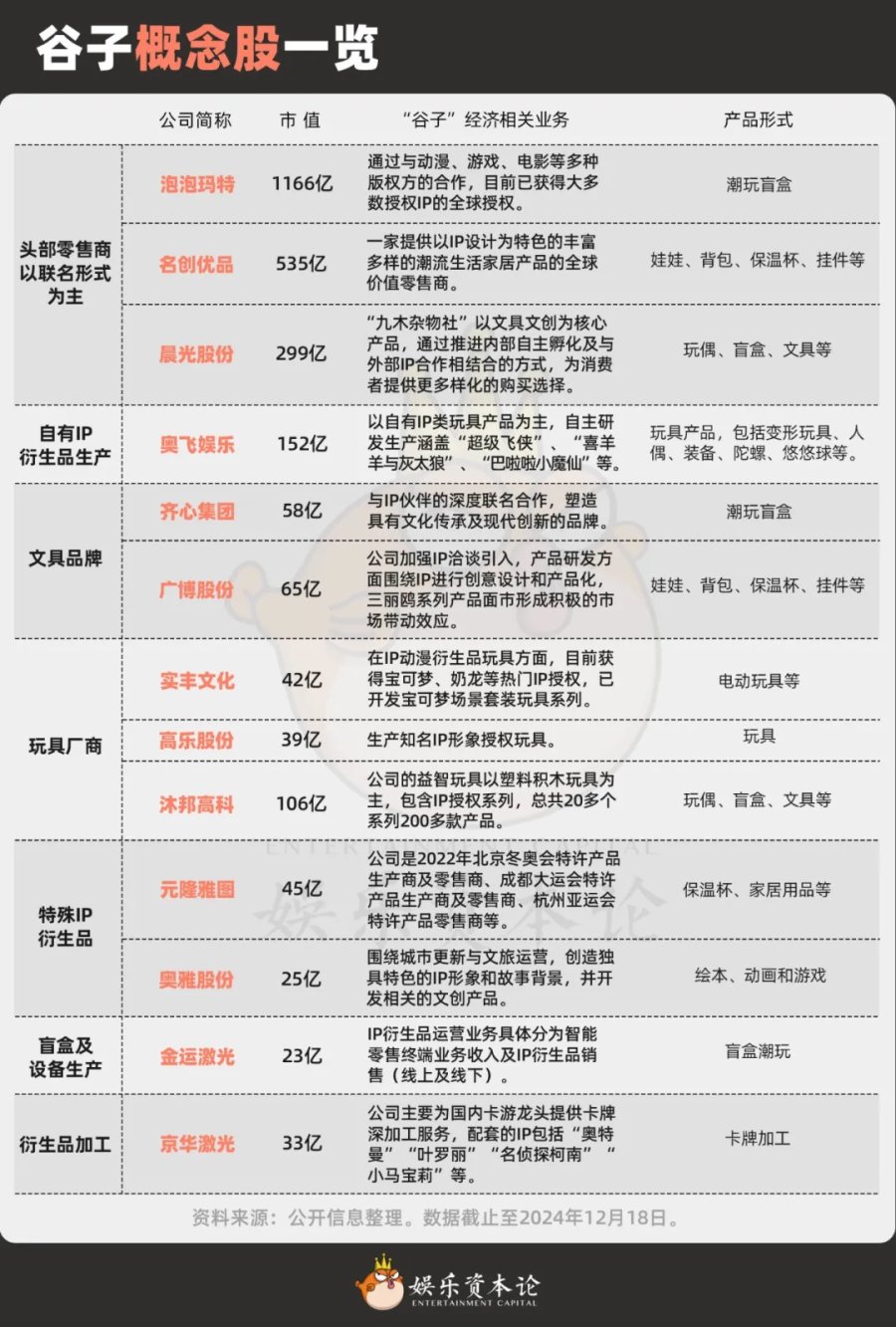 小娱整理了被讨论较多的部分谷子经济概念股。在整理的过程中,小娱发现部分被列入谷子经济概念的公司生产的产品和IP的实际关联非常有限;部分公司的商品虽然也有IP授权成分,但其形式也与市场公认的谷子形式相去甚远。这一点倒是很像前几天暴涨5亿的短剧概念股华菱精工,其背后也是一家名不见经传的短剧公司。