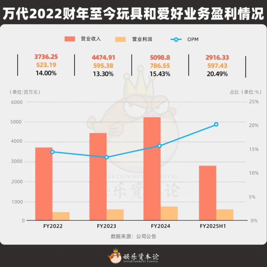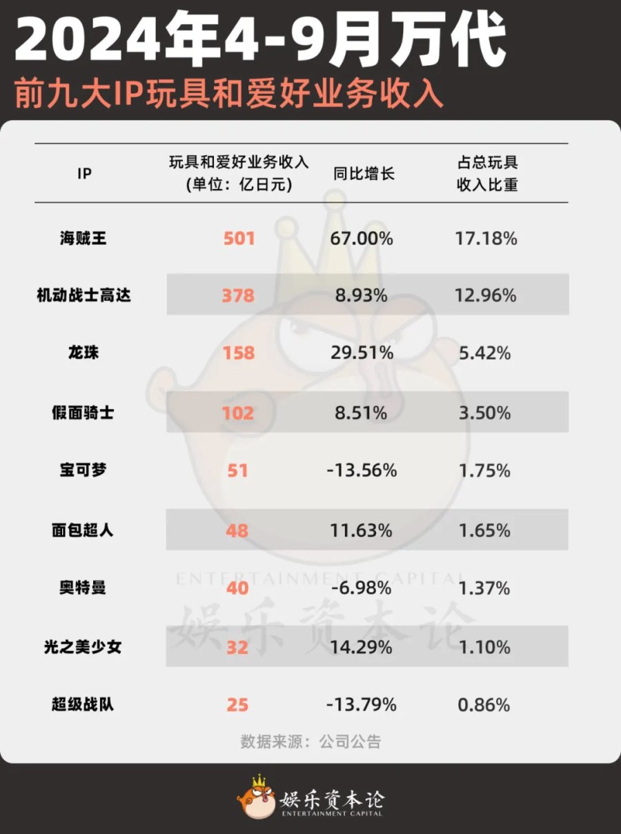 其中,玩具和爱好业务占万代收入近50%。今年二、三季度,万代玩具和爱好业务收入为2916亿日元(约为138亿人民币)。海贼王、高达、龙珠等经典IP贡献靠前。