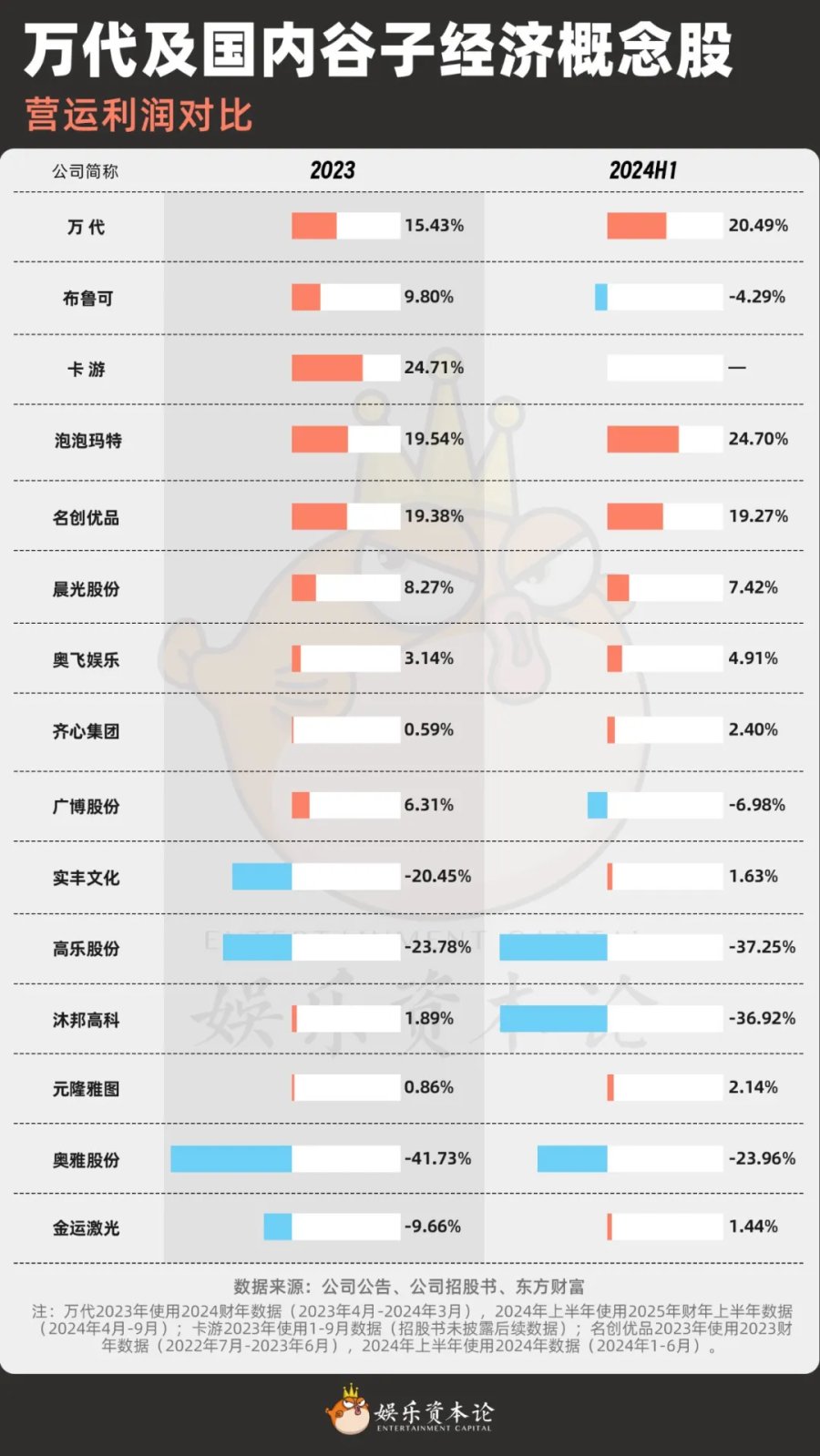 以万代披露的营运利润率(营运利润/营业收入)为基准,我们可以比较国内谷子经济概念股的盈利能力。与万代营运利润率相当的,只有卡游、泡泡玛特、名创优品三家企业。从商业模式来看,这三家企业也是最接近IP经济的运营模式的。