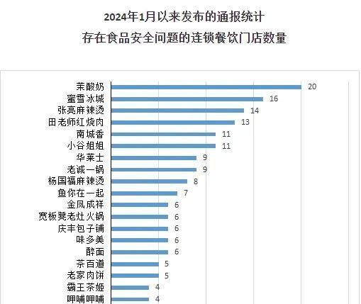 排在张亮麻辣烫之前的茉酸奶以20家门店,位居问题榜第一;蜜雪冰城有16家门店被通报存在食安问题,位列问题榜第二。此外,田老师红烧肉、南城香、华莱士、杨国福麻辣烫、霸王茶姬、呷哺呷哺也均榜上有名。