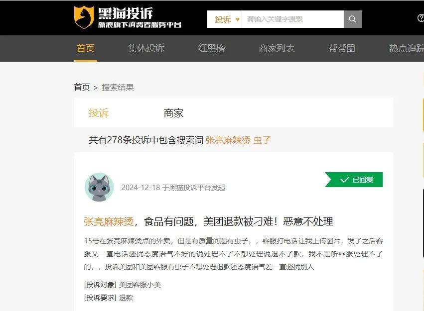 比如,今年12月11日,有网友在黑猫投诉留言称,其在张亮麻辣烫店里用餐,结果吃到了虫子,其找店员结果对方说给一瓶饮料。网友拒绝该方案后,对方说给他换一份,结果换的这一份里面东西少了不少。网友直言“气人”,要求门店按照食品安全法来赔偿。