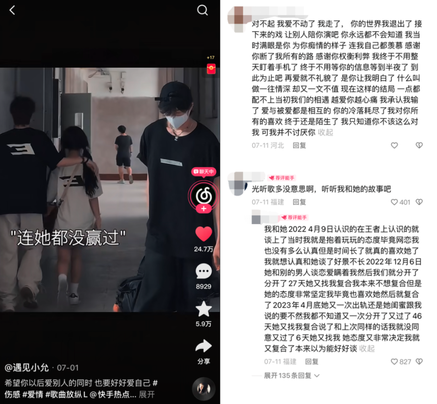 举一个简单的例子,今年年中,怪阿姨的一首《放纵L》戳中了不少人的心。细腻而直接的歌词,将失恋的挫败、情感的困惑交织其中,而在以快手为代表的短视频平台,一些失意的画面、遗憾的场景配上应景的歌词、旋律,大多人都经历过的痛心时刻涌上心头,共鸣随之而起。评论区里,不少人都在分享着自己的故事。