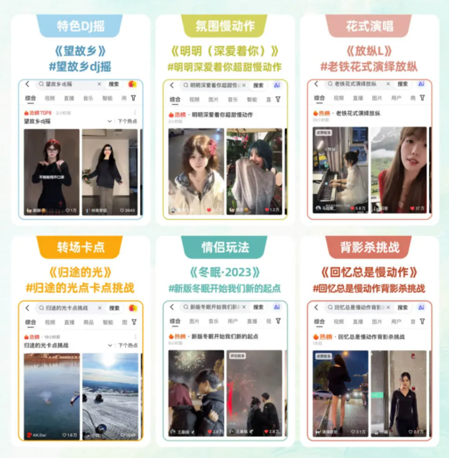 这并非是个例,《报告》数据显示,过去一年,快手「π」计划在资源和现金上的整体投入超3000万元,助推歌曲冷启动和爆款打造。其中,除了音乐分区banner、专属音乐聚合页之外,平台还结合不同音乐风格,上线特色DJ摇、氛围慢动作、专场卡点、古风变装等多种玩法,带动创作者二创联动,共同助推音乐热度爆发和长线传播。