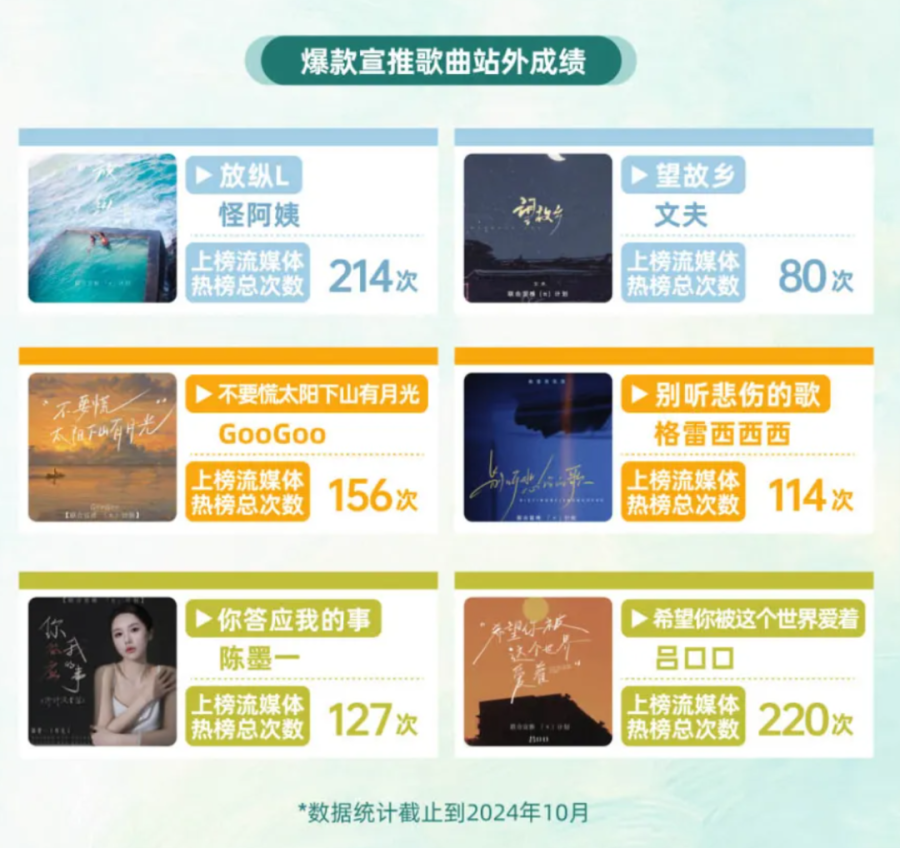 效果也是立竿见影,过去一年,快手音乐「π」计划累计宣推的80多首歌曲,在联合宣推期间累计发布视频量超过5400万,累计播放量超过450亿次。甚至,不少歌曲从站内火到站外,呈现出全网爆发的态势。例如,截至2024年10月,《放纵L》《希望你被这个世界爱着》上榜流媒体热榜总次数都在200次以上。