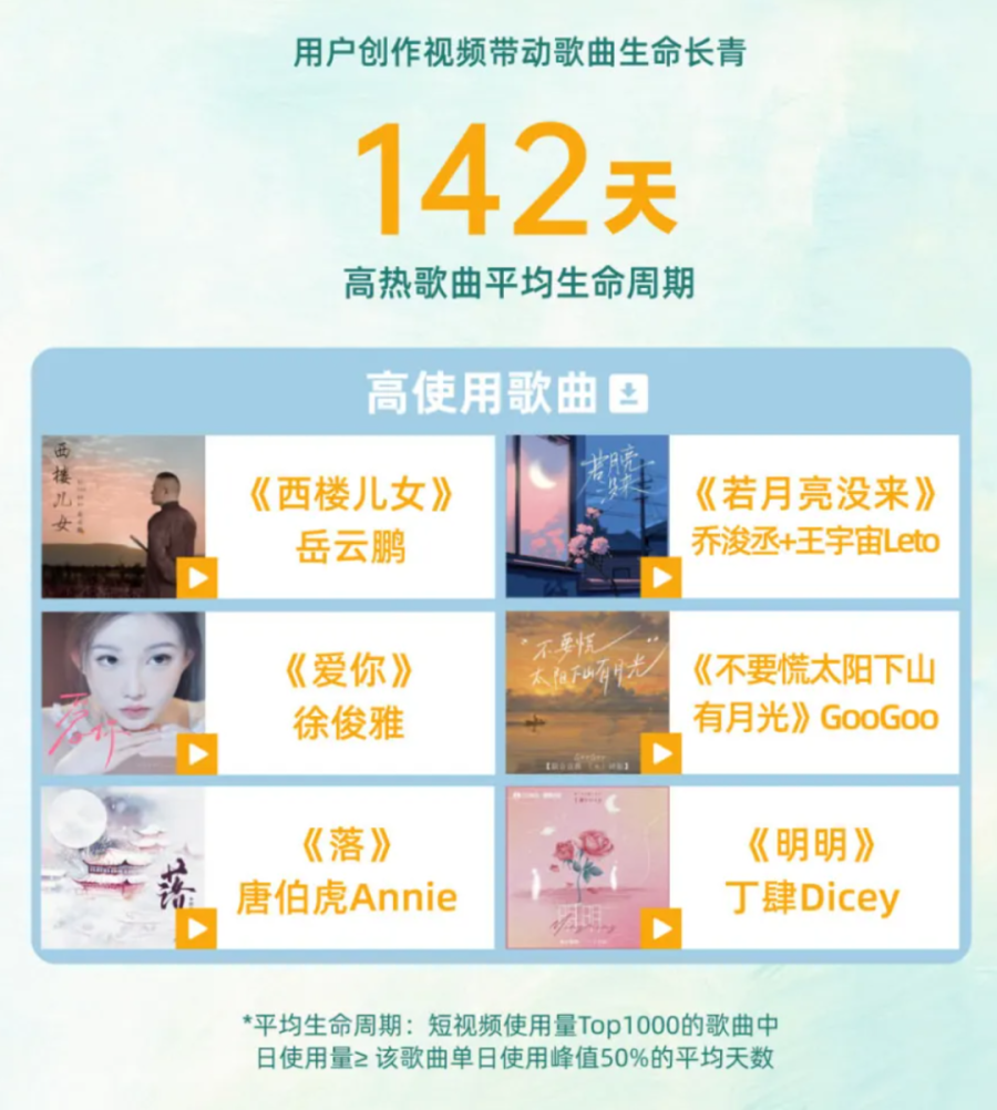 最直观的表现是,不少歌曲在快手走过更长的生命周期。《报告》数据显示,过去一年,平台高热歌曲的平均生命周期达到142天,尤其是在每天产出约5万首新歌的当下,音乐作品能够越来越长青,其价值无需赘言。