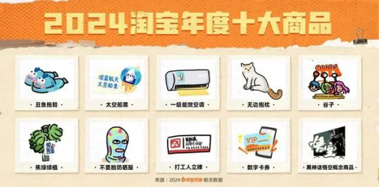 据悉,淘宝2024年度十大商品包括:丑鱼拖鞋、太空船票、一级能效空调、无边抱枕、谷子、打工人立牌、蕉绿绿植、“不要脸”防晒服、数字卡券、黑神话悟空概念商品。