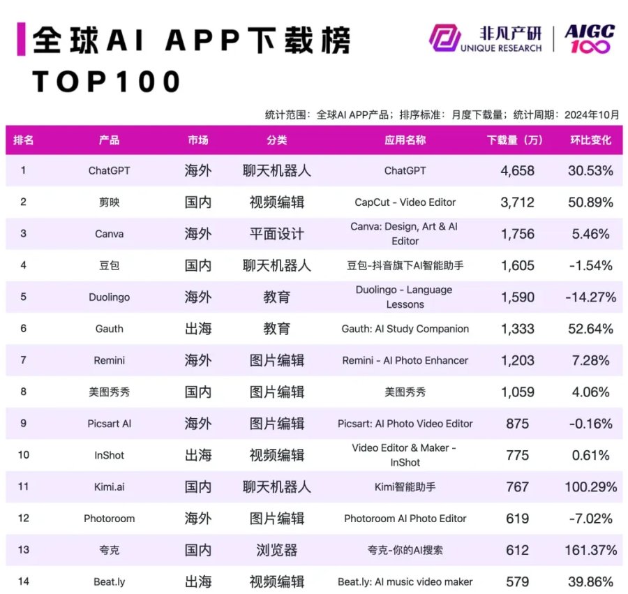 非凡产研披露的全球AI APP下载榜显示,2024年10月,剪映下载量为3712万,环比增长50.89%,排名第二,仅次于ChatGPT。对比而言,InShot、Beat.ly、快影等视频剪辑工具的下载量均低于千万,与剪映不可同日而语。