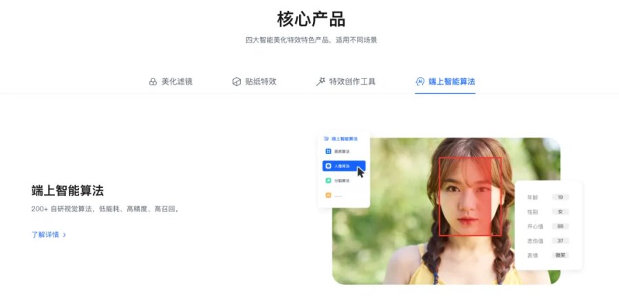 火山引擎官网显示,其智能美化特效目前支持200+自研端上智能算法,拥有美颜、滤镜、美妆、微整形、美体特效等多种技术,覆盖车载、运动健身等场景,并可针对暗光极限场景优化。
