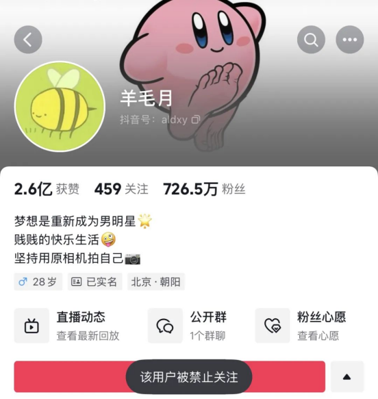 12月24日,网红“羊毛月”的账号已被禁止关注。
