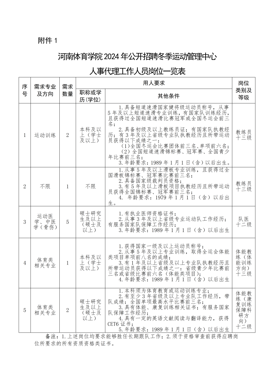 详见《河南体育学院公开招聘冬季运动管理中心人事代理工作人员岗位一览表》(附件1)
