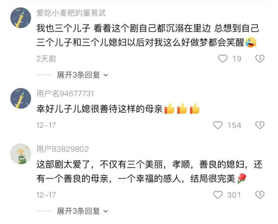 这部剧中,三个儿媳分别是首富、明星、武馆馆主。区别于传统“打脸恶婆婆/恶媳妇”的故事,该剧塑造了完美的婆媳关系,让评论区直呼羡慕。每一个高潮剧情点,都发生在女主被前夫及其家人羞辱后,三个儿媳妇登场,帮助女主惩治反派的时刻。