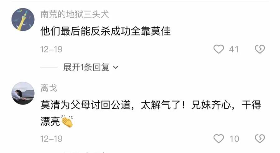 最后10集,大姐反复找寻证据差点被仇人发现又因为男主的帮助、与自己的机智反转局面,逃脱困境。每一集的钩子都是大姐即将被发现的剧情,紧张感做足后又反转,充分调动观众情绪。在大姐最终成功帮助男主复仇的结局下,其原本的人物逻辑也得到圆满,临近结尾原本有争议的角色,到后面评论区也表示“没她不行。”