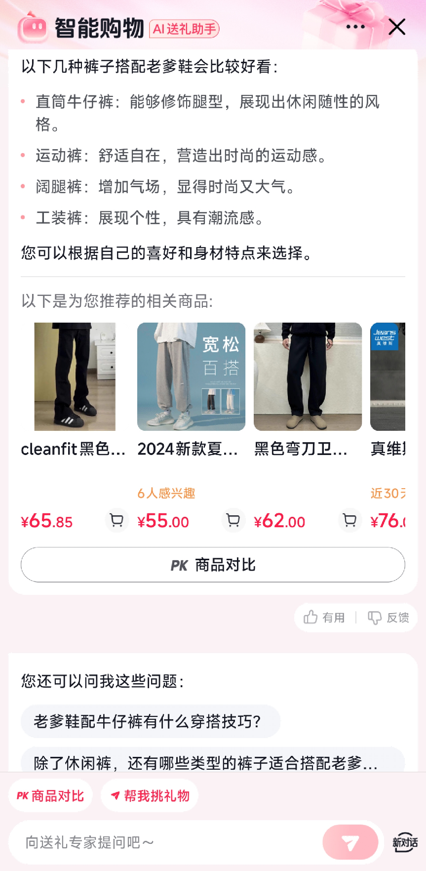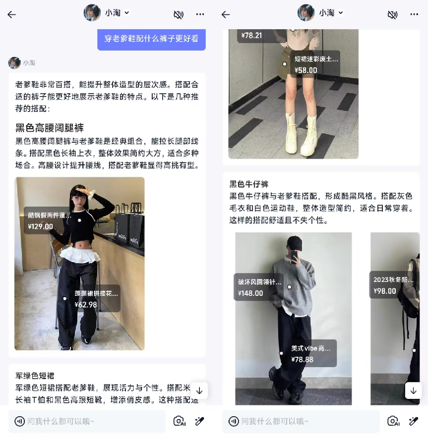 各家具体表现上,我们尝试询问“穿老爹鞋配什么裤子更好看?”,“淘宝问问”给出了不同性别不同风格的搭配,简单阐述了其优点,还附上了模特穿搭图和具体链接。