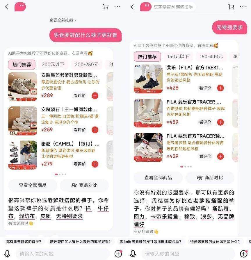 “京东京言”回复里表明帮忙挑选裤子,从材质、价格、品牌问了个遍,但实际推荐全是老爹鞋,有一种“已读乱回”的美感。