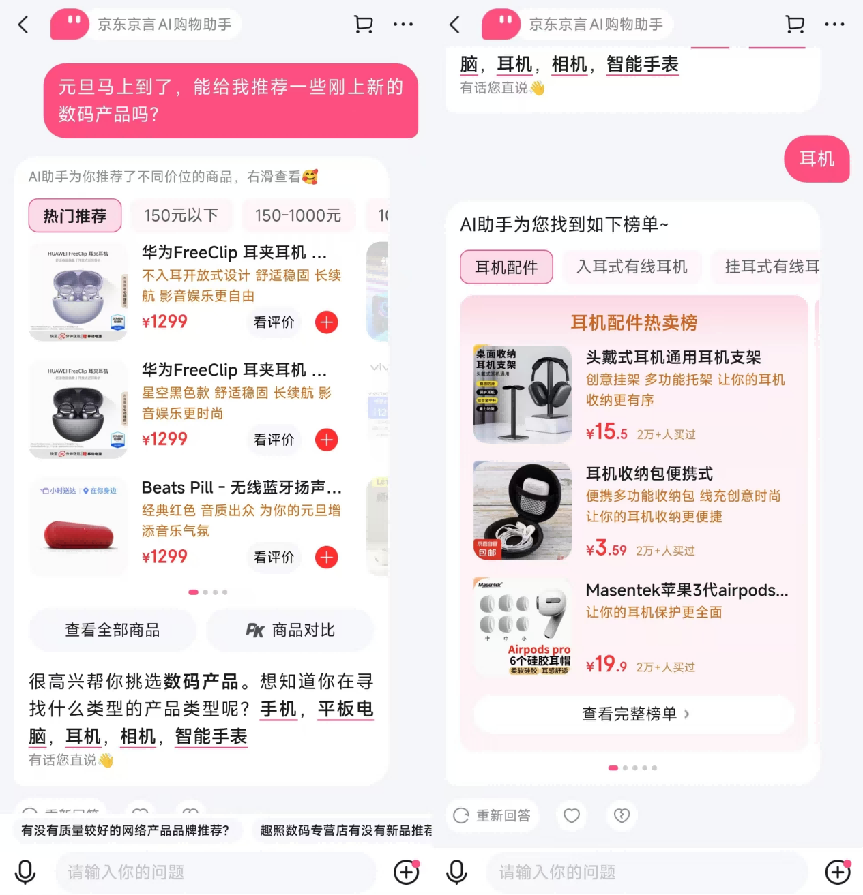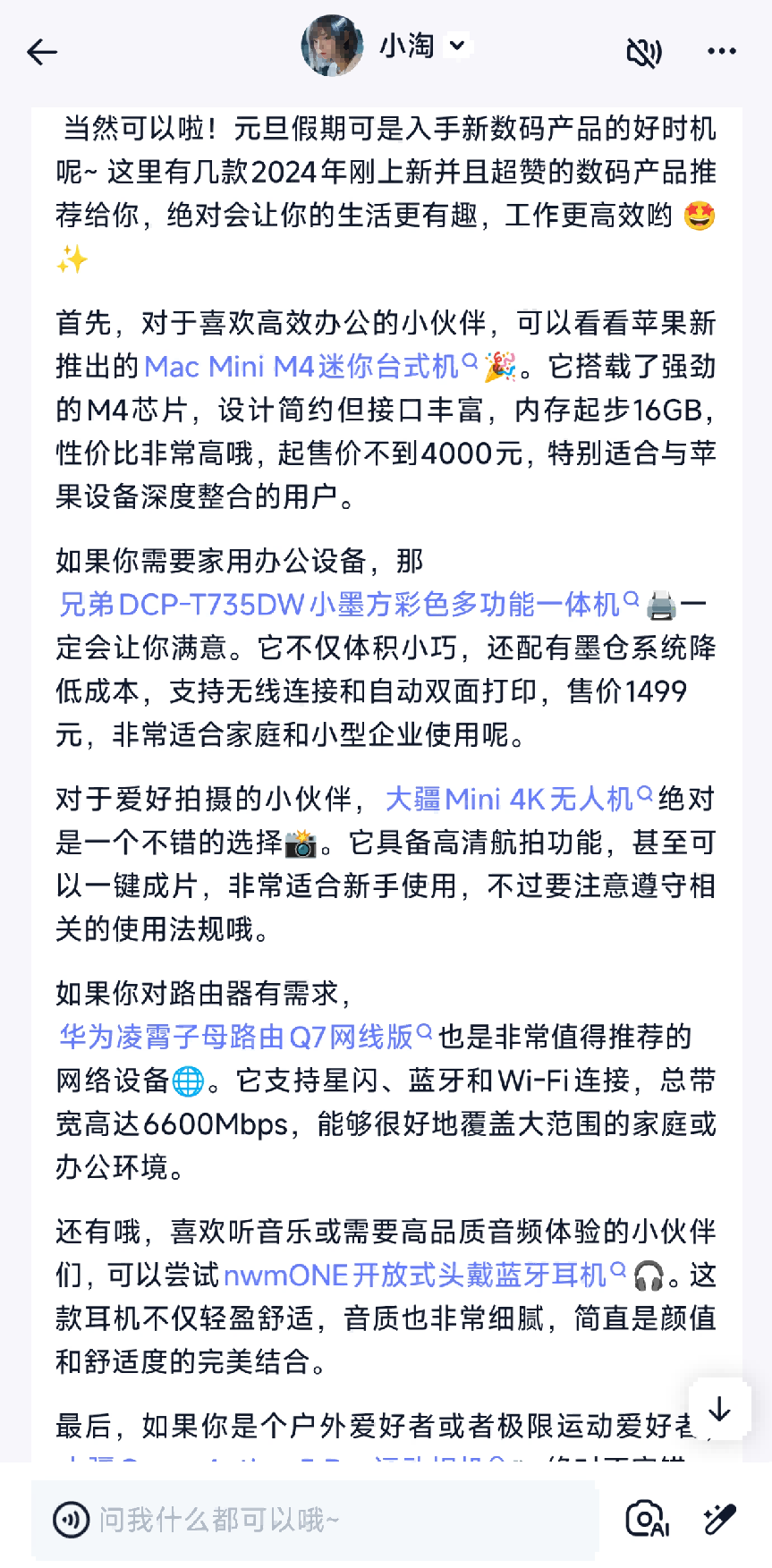对于更泛化的需求,我们先以“元旦马上到了,能给我推荐一些刚上新的数码产品吗?”这个有时效的问题开始。