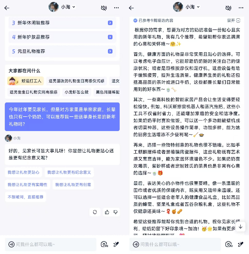 接下来尝试在句子中加入多个主语,看AI能否辨别消费者需求,询问:“今年过年要见家长,但是对方家里是单亲家庭,长辈也只有一个奶奶,可以推荐我一些送单身长辈的新年礼物吗?”