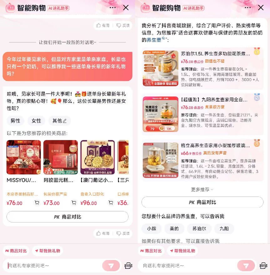 抖音“智能购物”再次语出惊人,主动询问长辈是男是女,不知是分辨出了前一句性别模糊,还是没能识别出后一句的奶奶,但点击送养生壶后,回答的是为您推荐“适合送喜欢健康与保健的男朋友的奶奶的养生壶”这一句莫名其妙的话。