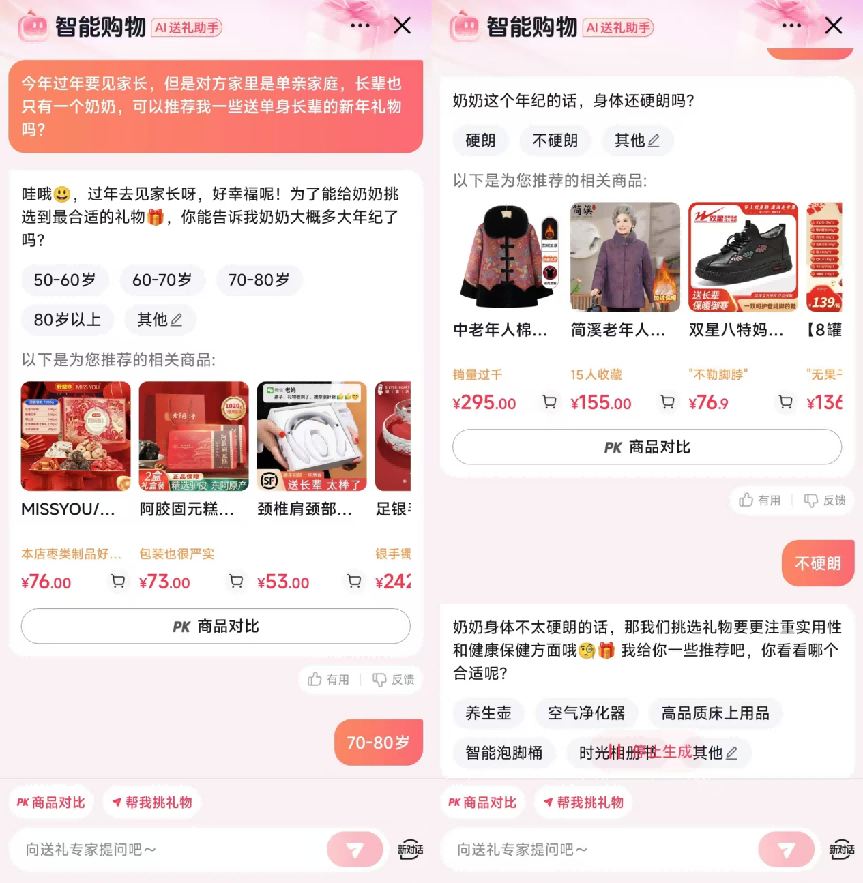 将这个问题再问一遍,也变成跟淘宝和京东一样,默认为送给奶奶礼物,还以具体年龄提供选项,并询问老人身体是否“硬朗”,最终推荐健康保健类的礼物,显得比较人性化。